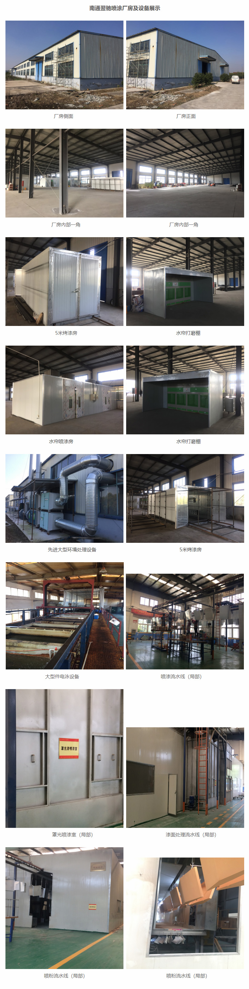 南通翌馳工業(yè)配件有限公司占地面積5000余平方米,建筑面積3000余平方米,擁有現(xiàn)代化環(huán)保型涂裝生產(chǎn)線三條,均采用國內(nèi)先進的設(shè)計和建造理念,集科學(xué)、自動、高效、節(jié)能、環(huán)保為一體,在進一步提高核心競爭力的同時,降低了污染排放,強化了社會責(zé)任感。公司目前擁有大型自動化靜電粉末噴涂流水線一條,大型環(huán)保型噴漆流水線兩條。同時配套有無塵打磨房、水幕噴漆房、無塵噴漆房、高低溫烤漆房、環(huán)保型噴砂房、脫脂磷化槽、污水處理設(shè)備等現(xiàn)代化設(shè)備??杉庸らL度20米,單件重量可達十噸以上,日噴涂量1000㎡以上。
